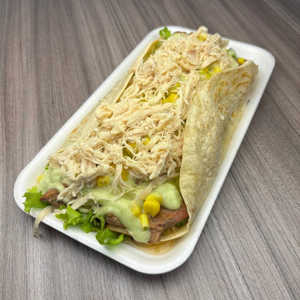 Tortilla Harina, Lechuga, Cerdo en trozos, Cebolla, Queso, Maíz, Pollo Desmechado, Salsa casa y Guacamole.